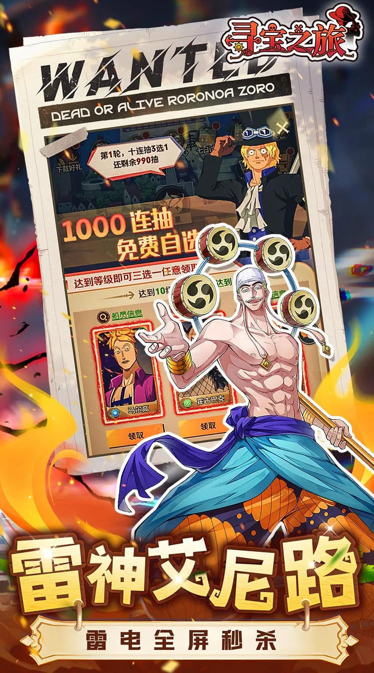 伟大航路等你出发!《寻宝之旅》是集育成、冒险、对战于一体的热血海贼题材动作卡牌手游,带你穿越经典剧情,挑战海上王者,揭开One Piece的真正秘密,重燃“成为海贼王”的梦想!开局0.1折直送满星路飞,一拳破屏,战力爆炸狂飙,主角光环拉满!艾斯、索隆、山治、香克斯等人气角色全收录,自由组建你的最强草帽团,挑战四皇、冲刺最终之岛!经典剧情复刻、霸气系统、恶魔果实、伙伴羁绊统统还原,动画名场面全程高能重现!探索伟大航路,揭开One Piece真正的秘密,这一次,由你主导结局!