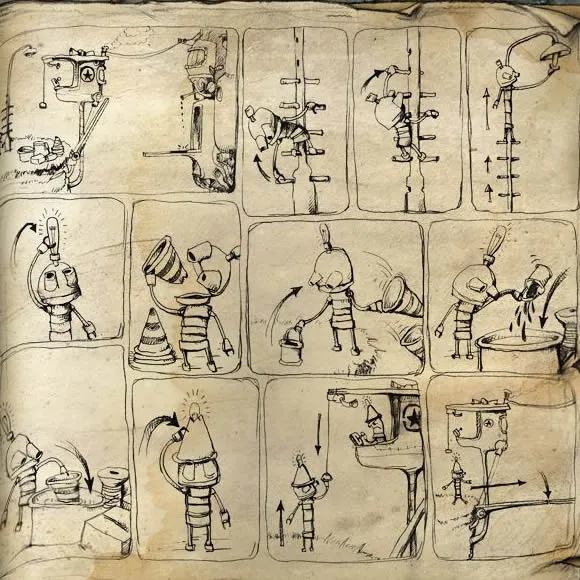 刚进入画面,就被人一脚踢翻,哥们可是主角啊!会看到有一个机器人走过来,拉了一下拉环,另一个机器守卫马上把桥放下来,让他通行。我们也拉一下环,警卫说头上没灯的异类人不准过,看来我们需要伪装一下。先拿一个那个圆锥型路障,然后把其余的都拿起来扔掉,里面藏着一罐油漆,拿起油漆,再走到路灯旁,往上爬,爬到爬不动了点一下最下面的杆子,可以将其拿起来,然后再拖到上面的孔上,如此两次就可以爬到最顶端,然后拉长身体,点一下电线杆顶端的灯泡就能拿下来,然后走到装了白油漆的脸盆那倒入刚得到的蓝油漆,再把路障拖到里面染染成蓝色,把路灯拖到帽子上合体,再把帽子戴上,就可以拉动拉环骗过守卫放下桥了。眼看快走过去了,结果一脚踩上油,矮油,摔下去了,真是祸不单行啊。