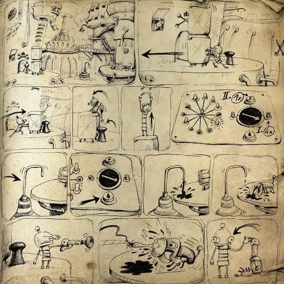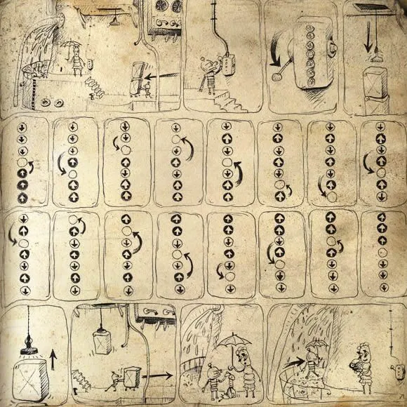 出门之后发现右边走不通,只能往左走,到左边发现有漏水过不去,正好有个打伞的机器人,跟他说话得知他要一只狗,正好右边对岸有一只狗,用刚才的枪打一发,发现被挡住了,还得想办法,点击门右边的垃圾箱,发现居然可以推动,一直推到左边另一个地图的楼梯处,上楼梯有个红盒子打开又要玩一个小游戏,类似跳棋,需要将两边的按钮调换,走错了可以按右边的按钮重来,完成后按左边的操纵杆,会有一个吸盘降下来吸住垃圾桶,再把操纵杆推上去吊起垃圾箱,现在垃圾箱只有一个了,再原路推回去。