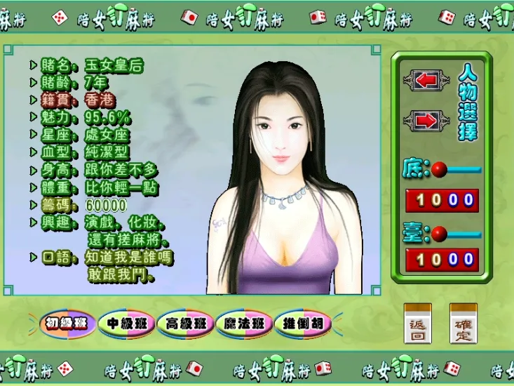 《陪女打麻将》是一款模打麻将为题材的休闲游戏。在游戏中只要你能赢得她的芳心,美女就会乖乖向你臣服的。由来自日本,台湾,香港,澳门,大陆等地区,各色美女陪你打麻将,与你单挑,此麻将为二人麻将,上面的美女会说各地方言,比较有意思。游戏里有8位性感迷人的美女轮流陪您打麻将,如果您赢了美女,你就有机会一亲芳泽。文章源自阿飞游戏网-https://www.afeigame.cn/13969.html