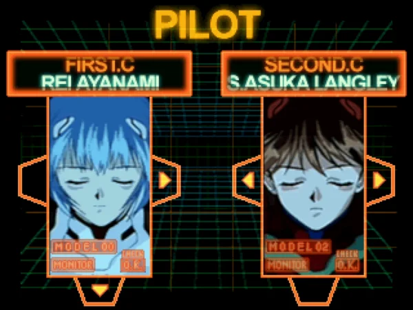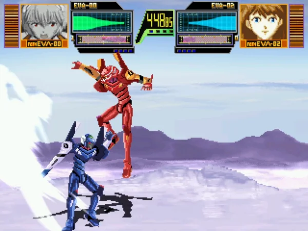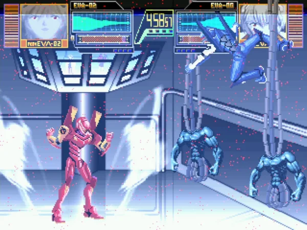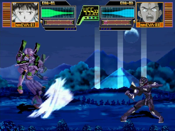 《新世纪福音战士》是日本早期的一个很有名的动漫,当时也改编了不少游戏。制作以这个为主题的格斗游戏的应该是一个老漫画迷了。游戏可选的人物不多,一共才6个可选人物,人物在战斗中是穿着战甲的。