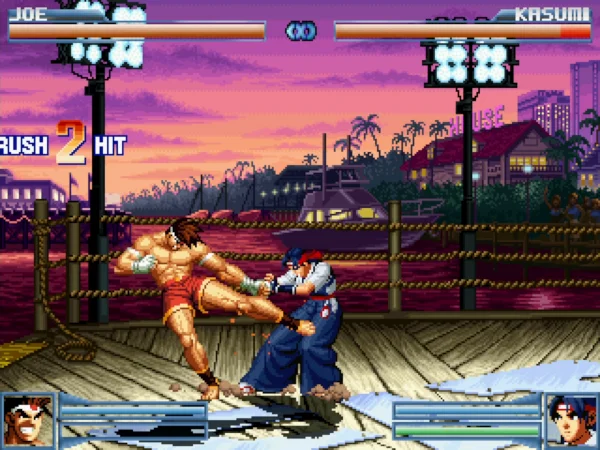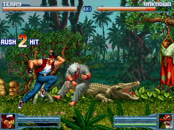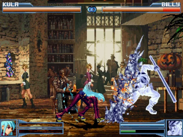 这是一个早期的制作得还不错的格斗游戏,游戏可以选择的人物并不多,只可以选择14个角色,包括特瑞、草薙京、东丈、冰女等,大多数角色都是来自于饿狼这条故事线的。游戏的战斗招数做得是很不错的,非常好的还原了街机的精髓,游戏虽小,但五脏俱全,相比于现在动不动就上百号可选角色的MUGEN来说,是一个不错的小容量精品!