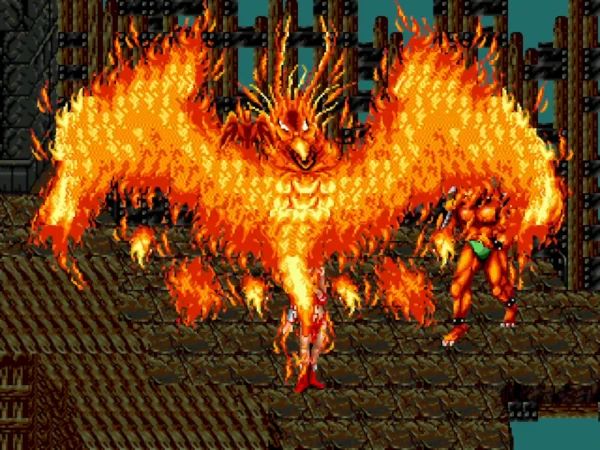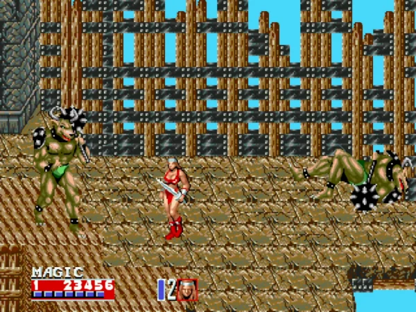 《战斧2》是MD“战斧”系列的第二部作品,这一部主角三人的造型全部变更,男人更为英武,女人则更性感大胆。主角动作有一定增加,动作相当丰富。可惜关卡背景仍然简陋,只有岩洞的立体场景令人眼前一亮,与黄金斧王决战的大厅透视效果也值得一书。音乐方面,游戏开头的鼓点令人难忘。