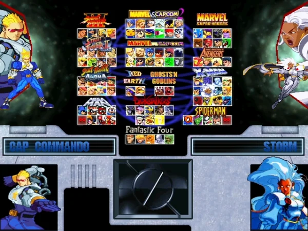 游戏的所有的角色都来自于漫威动漫和卡普空的格斗游戏系列。游戏的选人界面有别于传统的MUGEN游戏,把所有的出场人物分游戏列了出来,这让我们非常的清楚这些角色来自于哪个游戏。我们可以看到这个游戏的人物组成:街头霸王系列、洛克人、漫威对卡普空系列、红色大地、恶魔城、恶魔战士、神奇四侠、复仇者联盟、X战警和蜘蛛侠等知名的格斗游戏或者是漫威角色,可选人物也很多,有将近100个人物,每个人物都保留着原版中的招式和必杀技,游戏的对战背景很丰富。