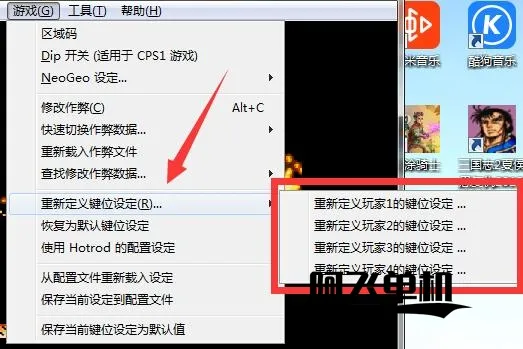 载入游戏后,点击“游戏”,鼠标移动到“从新定义键位设定”,会显示出4个选项,分别是玩家1到玩家4的操作按键设置,玩家可以根据自己的需求去更改相应的按键。(如下图)