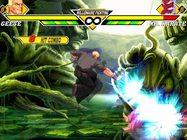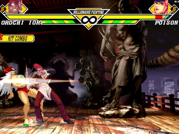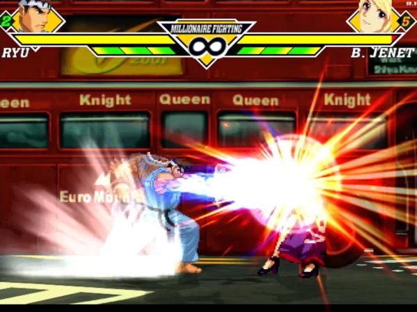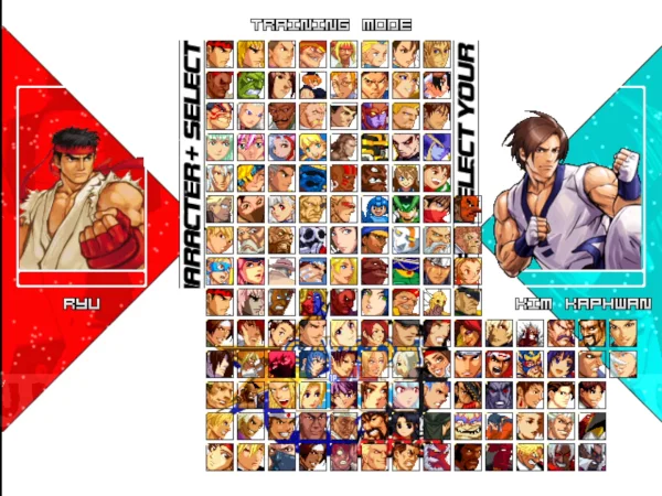 非常好玩的一个大乱斗的格斗游戏。游戏包括了SNK和卡普空格斗游戏中的相当多的角色,来自卡普空的街头霸王、恶魔战士、快打旋风、洛克人等经典游戏角色对战SNK的拳皇、世界英雄系列、侍魂等格斗人物。可选人物很多,角色的造型也很不错,让人惊喜的是有很多漂亮MM表现十分的抢眼,甚至有大家都很喜欢的爆裂人复仇中的性感美女Tia,她的选型在游戏中也是很漂亮的。游戏的格斗场景也制作得很不错,人物的招式连畅,连招打出来非常的爽快,战斗画面的表现也很好,是一款不可多得的精美格斗游戏!