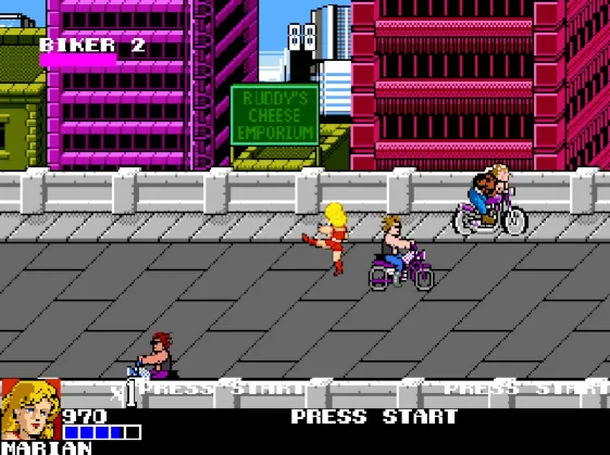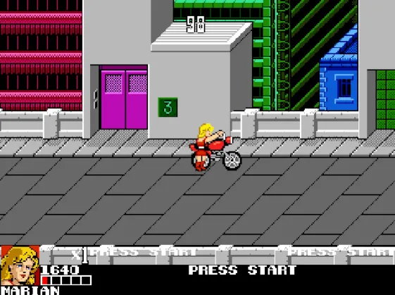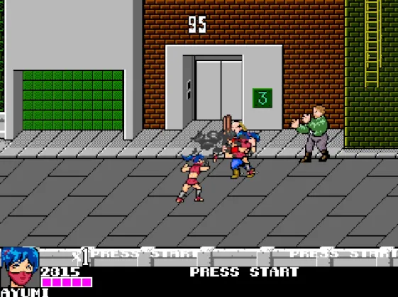 我方一共可以选择可以选择19个角色,包括街头格斗中的贝尔塞克、双截龙初代的比利、比尔茨、街机双截龙3中的布洛瓦、双截龙初代中的杰米、快打旋风2中的梅基、玛丽安、K先生、FC双截龙3中的意大利BOSS罗尼、双截龙4中的比利、高中女生京子、美沙子、热血硬派中的里基、双截龙3中的陈、街机成龙踢馆中的托马斯、双截龙3中的忍者、忍者蛙、女忍者步美、杰夫等,游戏的风格偏向于早期的FC风格,不过颜色更加的鲜艳,游戏的关卡非常之多,各种BOSS分别来自于双截龙和成龙踢馆等游戏中。文章源自阿飞游戏网-https://www.afeigame.cn/16413.html