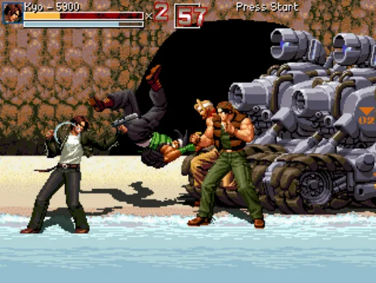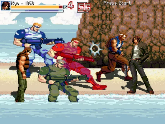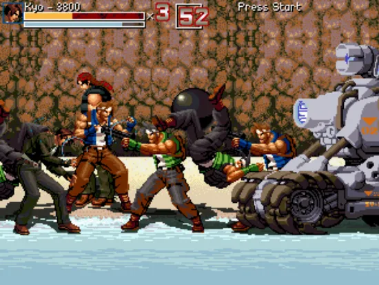 一个非常有创意的游戏,游戏中的主角是来自拳皇中的草薙京和饿狼传说中的洛克。游戏不是以往的那种横版动作游戏,游戏虽然使用了格斗游戏中的角色,却做成了横版射击游戏,游戏的难度还是挺大的,有些强力的敌人不容易打,子弹也不容易躲。游戏中的杂兵也主要来着拳皇,还有一些是合金弹头里面的主角和其他一些不知名游戏里面的角色。