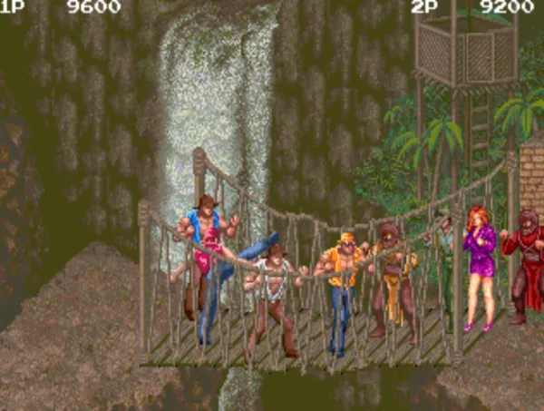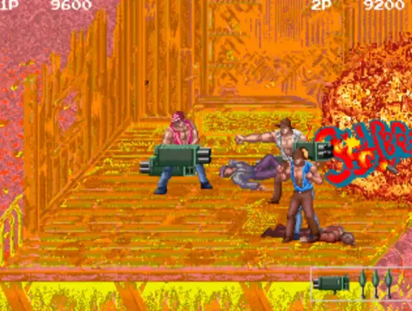 本作与《恐龙快打》类似,武器众多,只不过那些落地的武器要及时使用,否则会消失。最好用的不是火箭炮、机枪,而是长鞭,使用它可以攻击前后的敌人。可以对倒地的敌人进入追加攻击,双键齐按是必杀技,有武器时是扔掉手中握着的物品。