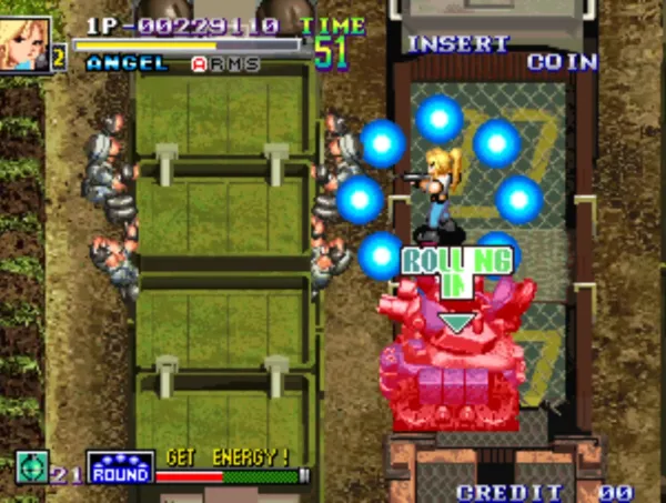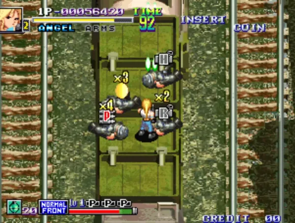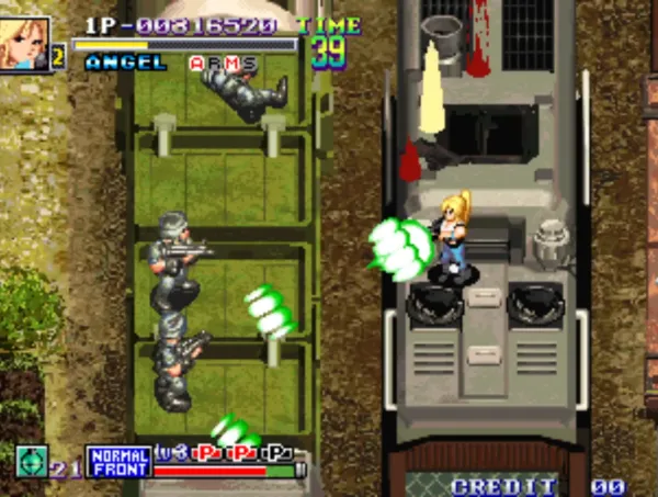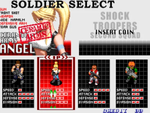 对于本作其实是一个不逊于合金弹头的游戏!你完全就可以把它当作一个俯视版的“合金弹头”。有多达8名角色可以选择,每个角色的火力、速度、血量、雷都不同,还可以一次选择3人合作或者是“独狼”独闯。虽然俯视游戏,没有跳跃,但是有闪避,敌人形象丰富、幽默,战场上可以获得的武器种类繁多,游戏及其爽快,合金弹头的完美前身,强烈推荐之。