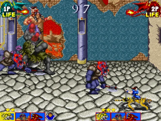 《邪城风云》是Tecmo1989年制作的一款动作过关游戏,游戏中玩家将面对一大群怪物敌人,游戏开始玩家操控的是一个骑在小人骑在一个巨汉身上,按C键可以变身骑在老虎身上,变身以后攻击速度提升了很多。当储存够足够星数的魔法时就可以变身为龙,可以说简直是无敌了,大部分敌人都抵受不住龙的一击。当变身龙的时间有限,每次变身都要消耗一颗星数,星数由加魔法的头骨补给,没黄色的星星时无法变身。