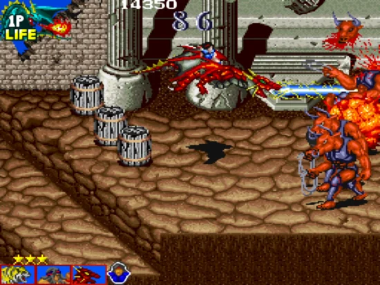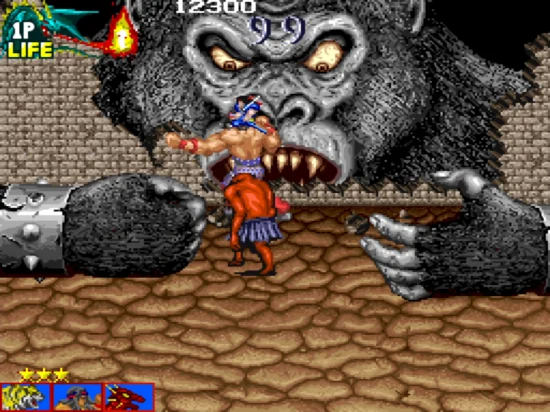 游戏中敌人掉出来的头骨有三种,一种是加魔法,一种是加血,最后一种是加分数。在游戏中不时会出线一只大猩猩,用两只手不停攻击玩家,只须攻击猩猩的手使它受伤到一定程度它就会撤退,但在以后的关卡仍然会出现,在打到最终BOSS时最后必须爬到它头上攻击它的角才能真正消灭它。