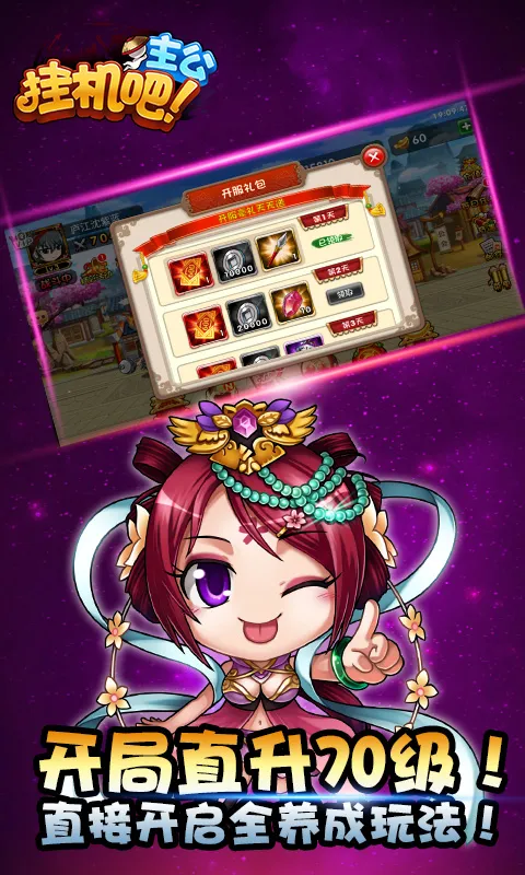 1、首续0.1折,充值比例1:10,开局直升70级!