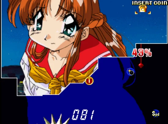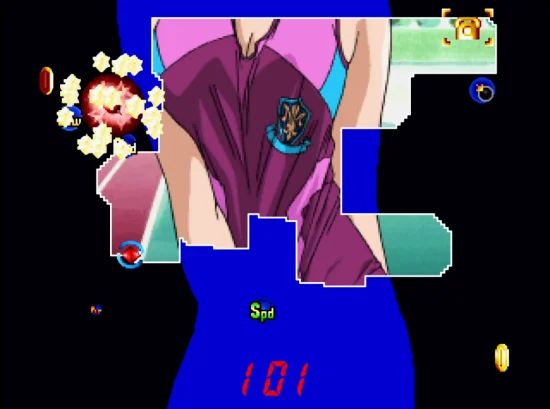 进入游戏中,选择Start选项,然后再任意选择喜爱的女孩角色后即开始游戏。游戏开始后,会出现一随意变化的白色框,玩家可按画线准备键决定其大小。在决定之后,若范围框大於5%,则会增加一颗炸弹数。而画面中的蓝色部份,就是玩家要框取的范围,框取蓝色部份若达 80% 以上,即可到达下一个关卡进行挑战倘若框取蓝色部份达 90% 以上,增加生命数一只。要是玩家完成度达 100% 的话,则除了可以增加生命数二只,还可以得到此张美眉的图片呦!欲欣赏收集到的图片,可到标题幕中的Album选项即可。