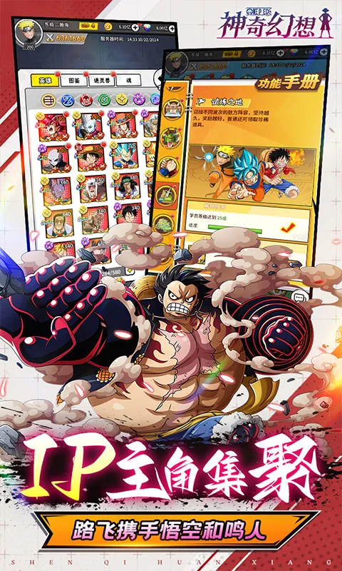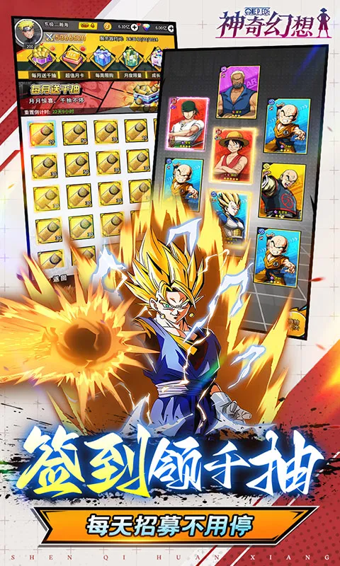 《神奇幻想》0.1折经典IP梦幻联动,海贼与龙珠火影联动!上线送UR英雄福利自选,充值永久0.1折!IP主角热血集聚,路飞携手悟空和鸣人! 路飞降临,完成进度送新世界路飞。还有七日目标送超赛神悟空。更有累计签到送千抽,每天招募不用停。经典动漫极致还原,超百位英雄,佛系挂机休闲护肝,挂机开箱永不停歇!