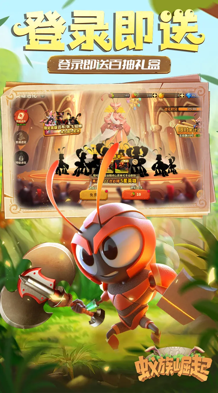 造蚂蚁王国,与何止百万玩家斗智斗勇,招蚁族豪将,丰富阵营赢下战争!在《蚁族崛起》你将作为蚁族统帅,建造你的专属蚂蚁王国。神机妙算的三国英雄、智勇双全的凯撒,还有数位出类拔萃的豪将,都等待你招募入队,成为蚁族中坚!通过资源囤积、城防修建、战力提升,将一方蚁穴壮大成为兵「蚁」强壮的王国城邦!与百万玩家结盟或是为敌,抵御强敌进攻,联手攻克城池,战无不胜,攻无不取,成为地下世界的霸主!