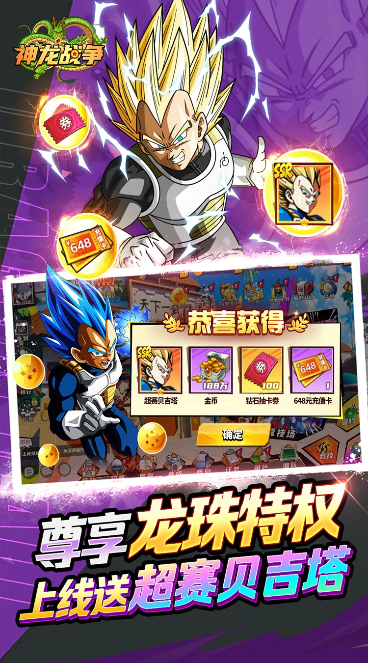 2、开局送超赛贝吉塔*1、金币*1888888、钻石抽卡劵*100、648元充值卡*1