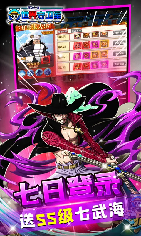 3、7日登录送S级伙伴:艾斯、大熊、鹰眼,SS级伙伴大船长巴基、汉库克;