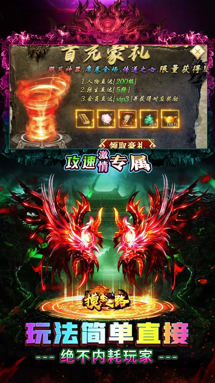 上线就送:施毒术-自动回收-自动拾取-刀刀切割!基础功能绝不卡玩家!零氪起号毫无压力,一路畅玩到底!打怪就可以爆充值红包券,时间等于一切!记得地图守BOSS,运气好直接终极不是梦!首充、特权玩家可以直接进入2大陆3大陆,快人一步!每日打怪在线就赠送真充,无需花一毛钱!回归传奇经典模式开区撸BOSS,运气好新手地直接出终极!