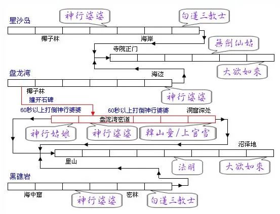 不救蓝兵的话,他会跑回去搬救兵,叫来魔教教头和几个小兵。在屏幕的右上方有一块石碑,撞击开来是一条小路--->4-D盘龙湾密道;不进小路向左走,就来到了海边。海边有一艘船,船上站着BOSS:羽化奇人神行姥姥。姥姥语:"终于还是被我等到了。"说完就打开了。船上会掉下一个箱子,里面有很多的武功秘籍。有吴品(或上官瑾)的"草上飞",黄荷的"凤翼双斧",熊千千的"灵蛛噬魂爪",朱星寒或葛天雷有"虎震式"
