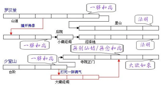 这里是少林寺的后山,到处都是枯树。地形对主角们不是很有利,但是可以利用枯树,打飞出去的枯树可以撞死武僧。过了这个地形就到了一个比较宽阔的地方,又是少林武僧,还有长老。主角们是不怕的。杀了狼(或和尚)后就到了BOSS:神秘高僧法明面前了。韩山童(阴魂不散)出现,掐晕了大欲。法明用"菩提三化功"超度了韩山童。之后法明语:"韩师弟的遗愿就由我来代为完成吧。"说完就变出了两个分身(上面那个是真的,打死他就过了)。勇敢的主角们终于打赢了法明。