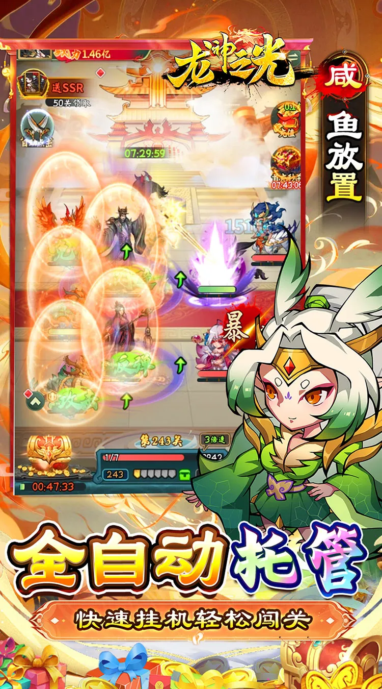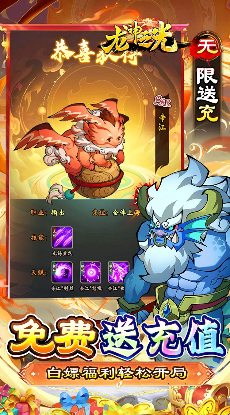 重温经典,共赴山海。《龙神之光》是一款高度还原山海经的咸鱼放置卡牌游戏。游戏中可以收集到众多的奇珍异宝和山海神兽,玩法轻松休闲福利全面升级,每天签到免费领648代金券,还有超多免费充值燃情助力。革新融合多重PVE、PVP玩法和趣味养成路线,全自动托管让游戏变得更为简单,即刻开启全新山海旅程!