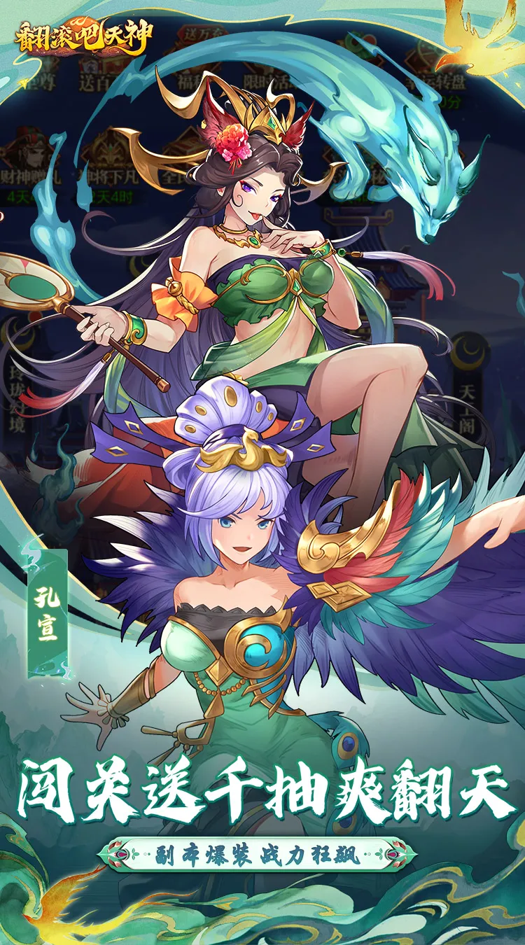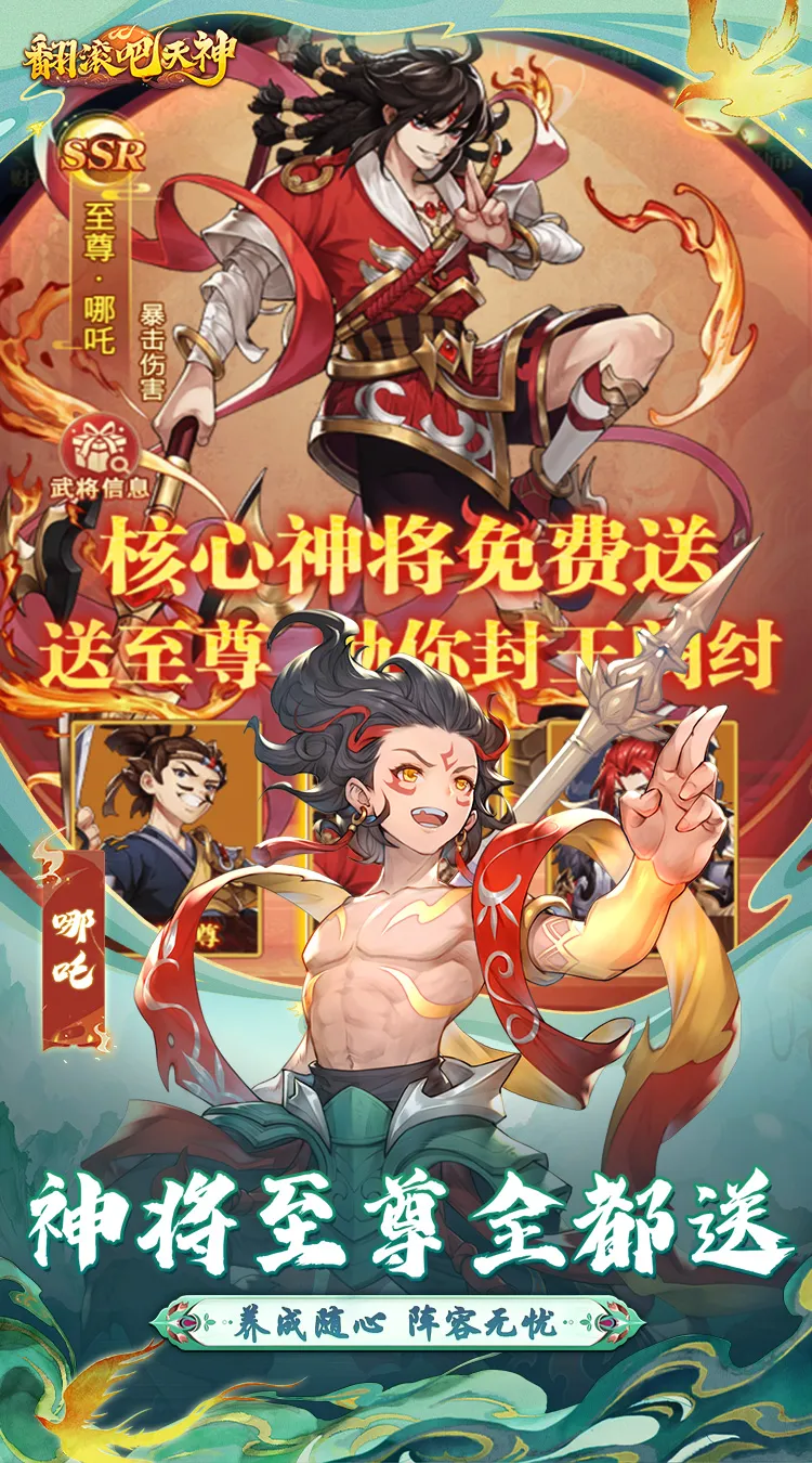 《翻滚吧天神》是一款封神题材的放置卡牌游戏,故事以家喻户晓的《封神演义》为创作背景,从杨戬,哪吒,李靖,姬发等封神人物的视角展开,一路远道出征,赴商伐纣,不断过关斩将,直指殷商国都朝歌城关的故事。