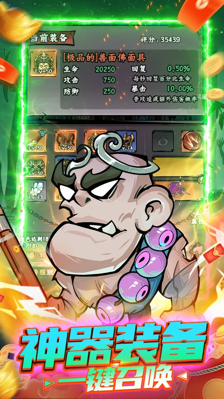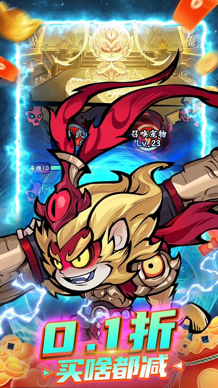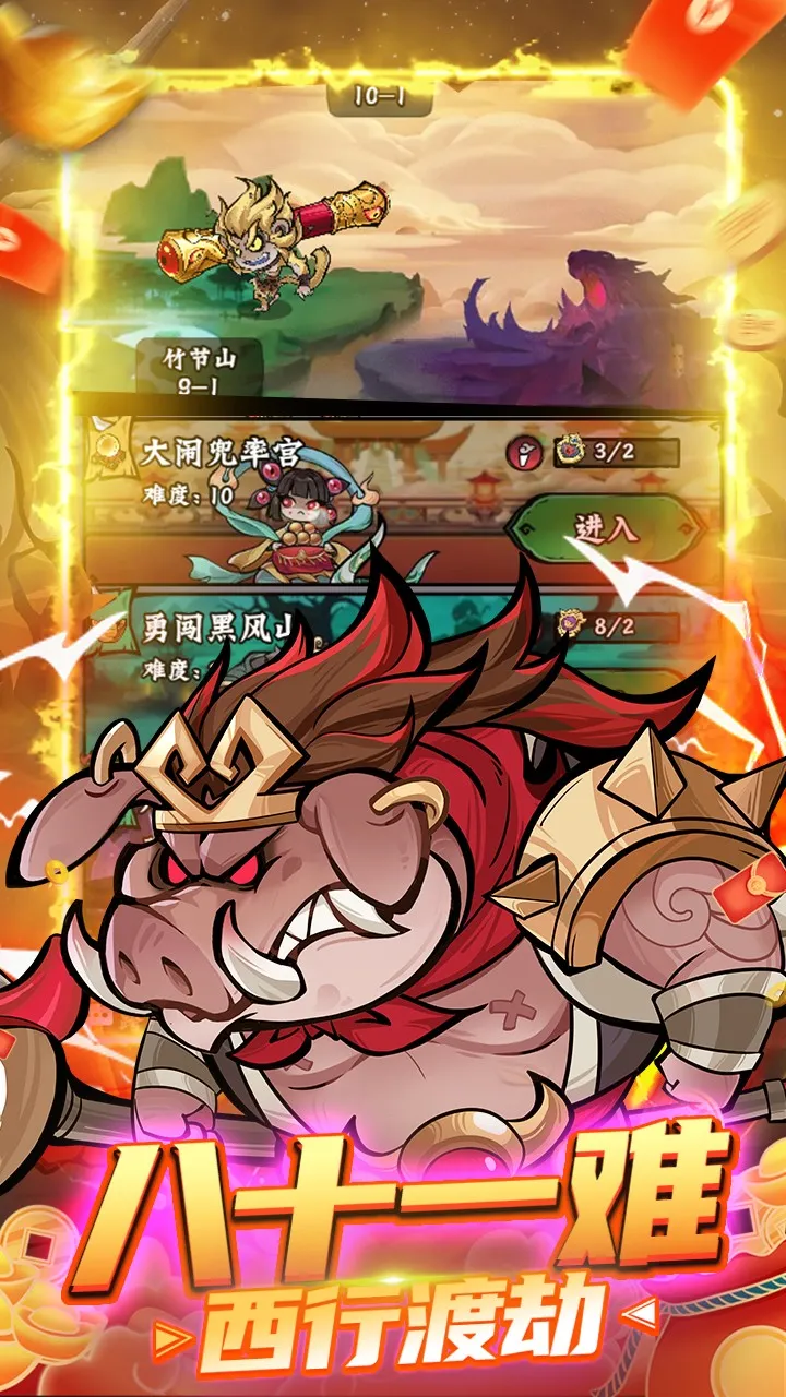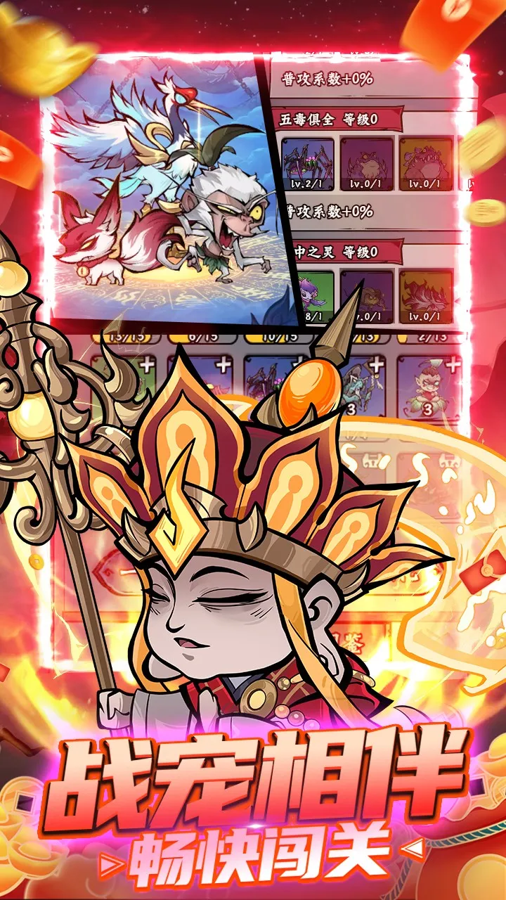 本游戏是一款玩法简单的放置类RPG游戏,基于西游记构建了一个虚拟世界,玩家可以扮演不同的取经人,获得耳熟能详的神兵法宝,学习各种神通法术,结识形态各异的同伴,在各种玩法中降妖除魔。