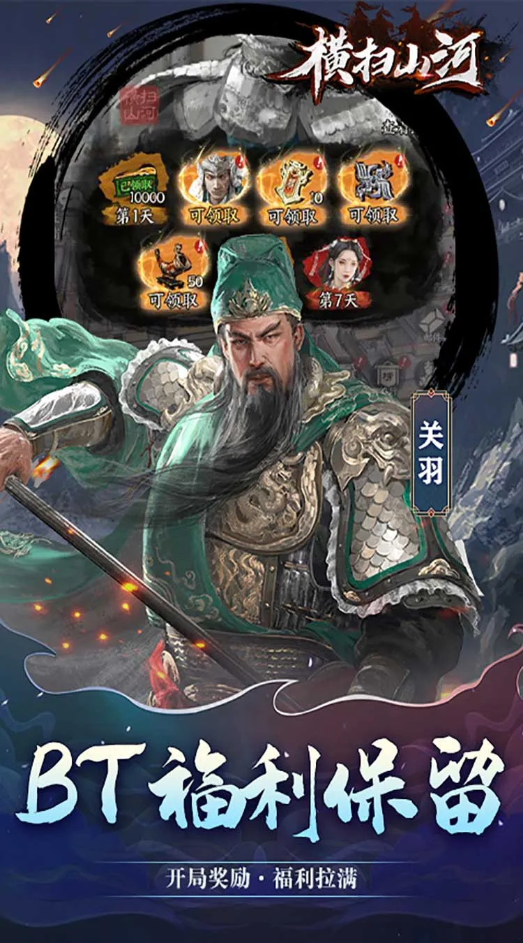 横扫山河游戏以三国时代为背景,玩家可以招募并升级各种三国名将的卡片,打造你的无敌之师。卡片各自代表一个具有独特技能和属性的三国角色。玩法是回合制,玩家需要在每一轮的游戏中做出策略,带领自己的军队参与战术对决。