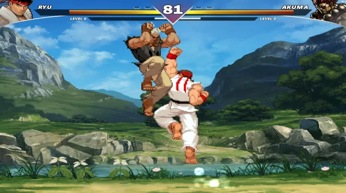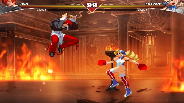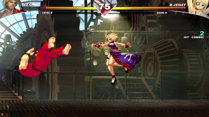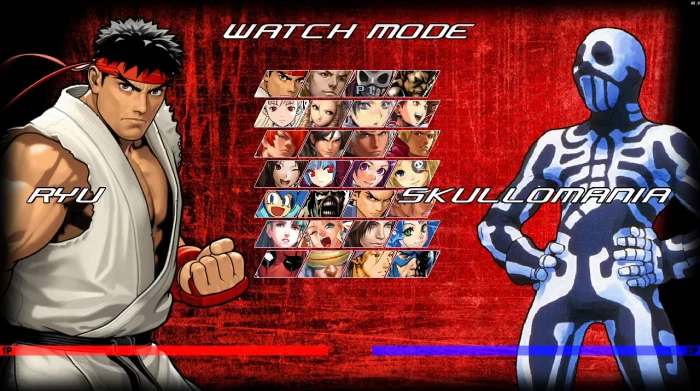 一个做得很华丽的格斗游戏,尤其是在选人的界面上,游戏的角色的图片非常的酷。游戏可以选择街霸、拳皇和漫威中的共28个角色。游戏的战斗场景也很华丽,漫威中有大家很喜欢的死侍出场,有些人物的造型还有着很大的改变。好比拳皇中的K的变化就比较大,除了招式外,衣服的颜色和角色的形象都有变化。游戏中大部分的人物都保留着原版的绝招,很多招式都做了华丽的渲染效果。