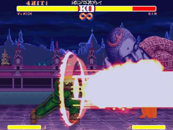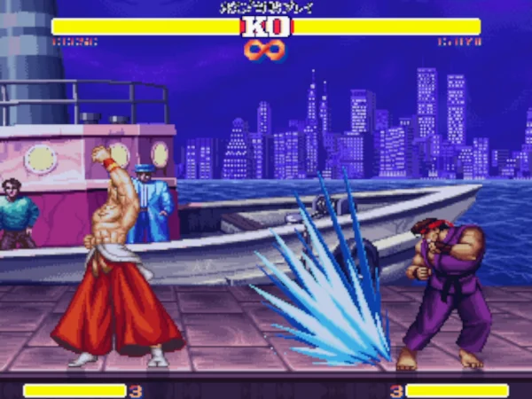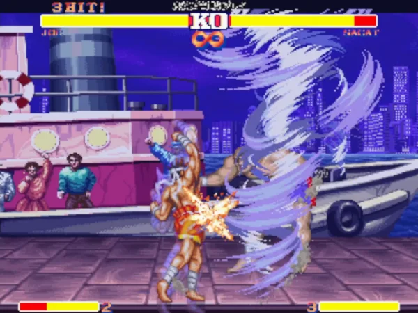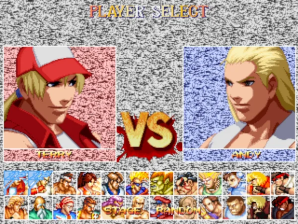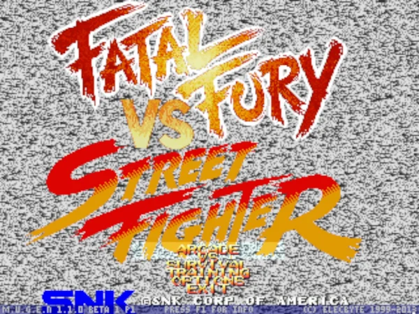 这个版本可能是早期的一个版本,因为后期还出过同名的游戏。不过出场人物和游戏的选人画面都有变化。游戏的可选人物也不是太多,饿狼中出场包括特瑞、安迪、东丈三兄弟,不知火舞、金家藩、达克、坂崎良、唐福禄、比利、卢卡尔及吉斯。街霸中出场的是隆、肯、青狼、春丽、古烈、四大天王等人气角色,最历害的角色还得算是杀意隆和杀意肯,非常强悍!