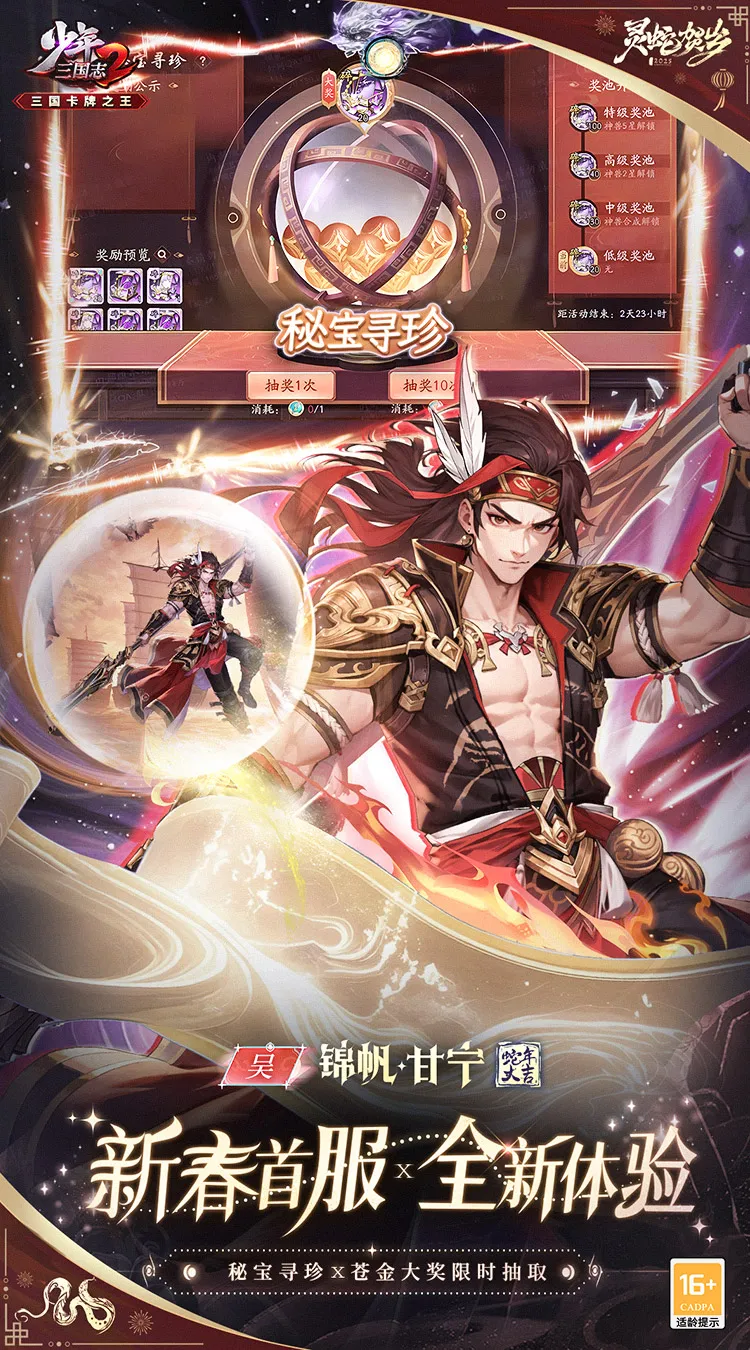 《少年三国志2》新春版本震撼上线!全新苍金五代武将【恶煞典韦】、【震威关羽】、【锦帆甘宁】、【制胜张辽】巅峰登场,助你所向披!全新神兵【七宝玲珑塔】降临,助你战力飙升!双重春节活动【年兽藏瑞】与【纳福迎春】上线,丰厚奖励等你拿!全新常驻玩法【发丘摸金】助你快速提升战力!春节超豪华礼包,苍金武将、装备大礼包等你领取,自动主线优化助力加速登顶!新春好时机,带上你的英雄一起创造传奇!