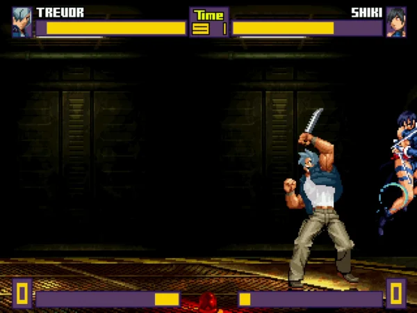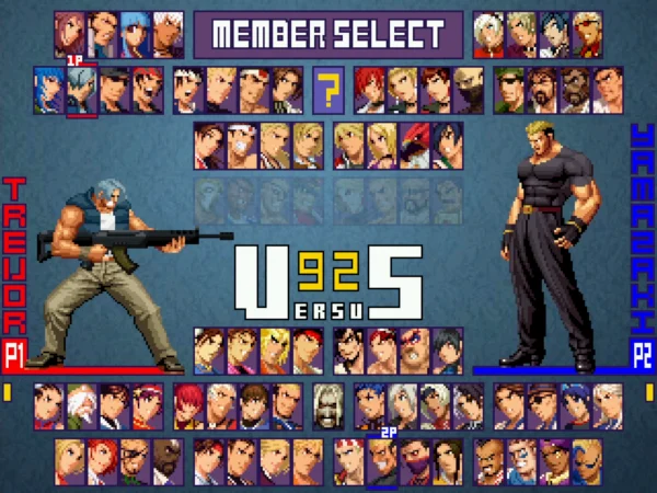 一款以《拳皇》为主题整合的格斗游戏,游戏中的出场人物大部分都来自于经典的格斗游戏拳皇系列。包括草薙京、八神庵、龙虎之拳队、饿狼传说队、中国超能力队等大家非常熟悉的角色都有出场。除此之外,游戏还有几个原创的角色,有合金弹头中的主角,不过招式好像是采用克拉克的。还有一个很像岅崎琢磨的中年大汉。再加上来自侍魂的霸王丸、牙神幻十郎、地震和色组成的侍魂队,还有来自街头霸王的隆、肯、春丽组成的街霸队。游戏的动作招式保留着各自原版中的招式,是一个制作得不错的格斗游戏!
