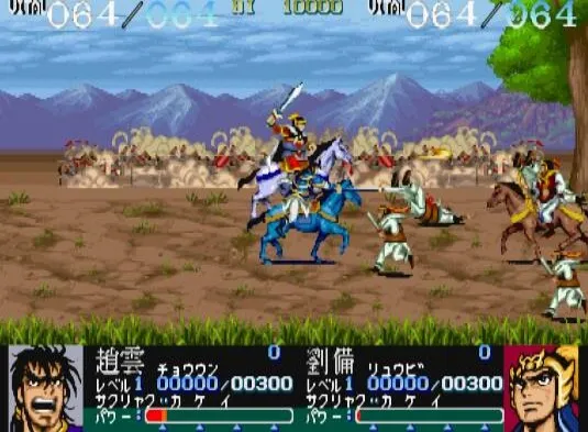 三国背景的游戏,选材是从黄巾之乱到杀死董卓为止,这个游戏是唯一的古代骑马打仗的游戏!共有四人可选,刘备、关羽、张飞和赵云。游戏以骑马作战方式进行,操作简单,招式较少,武将的血量以数字显示在顶部。人物和武器会随流程和分数而升级,个体之间差异较小。刘备和赵云出招快但集气攻击的威力弱,而关羽和张飞则集气攻击的威力强但出招慢。文章源自阿飞游戏网-https://www.afeigame.cn/9877.html