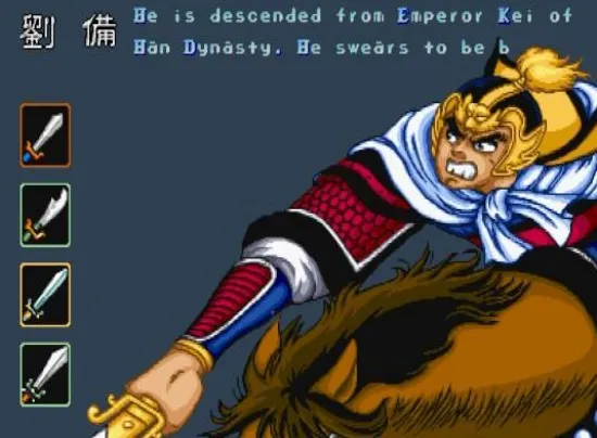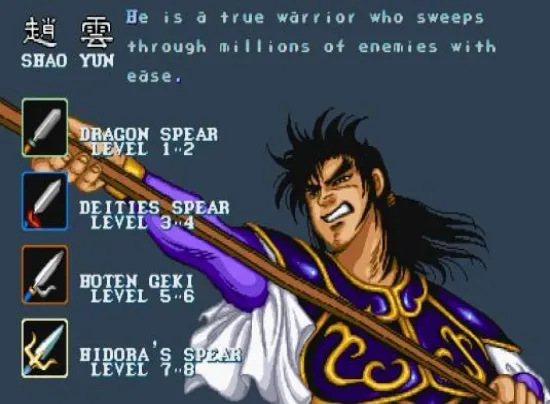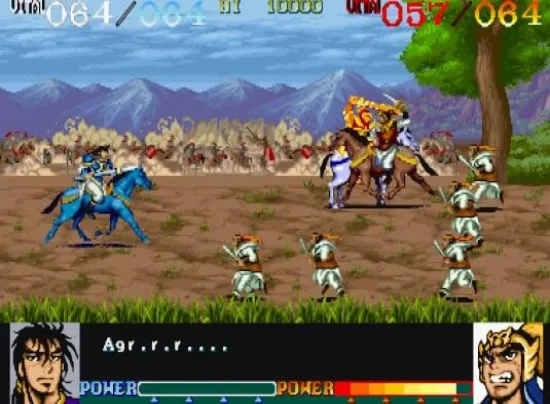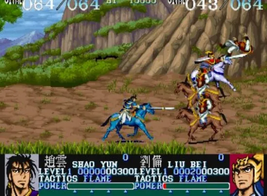 三国背景的游戏,选材是从黄巾之乱到杀死董卓为止,这个游戏是唯一的古代骑马打仗的游戏!共有四人可选,刘备、关羽、张飞和赵云。游戏以骑马作战方式进行,操作简单,招式较少,武将的血量以数字显示在顶部。人物和武器会随流程和分数而升级,个体之间差异较小。刘备和赵云出招快但集气攻击的威力弱,而关羽和张飞则集气攻击的威力强但出招慢。文章源自阿飞游戏网-https://www.afeigame.cn/9883.html